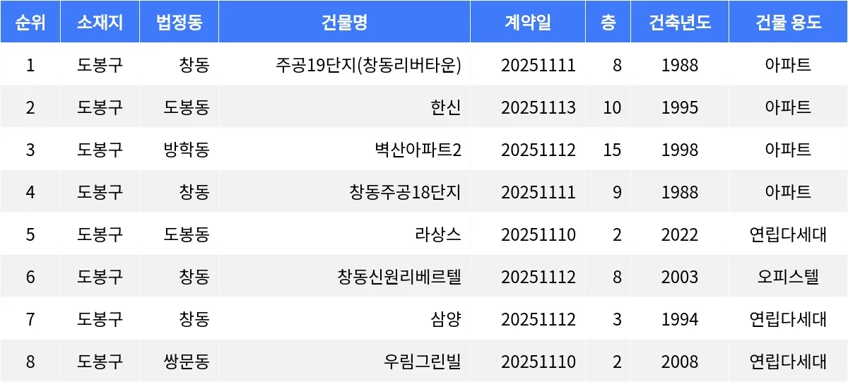 국토교통부 실거래가 공개시스템에 따르면, 11월 2주차 도봉구 부동산 시장에서 창동 주공19단지가 주간 최고 매매가를 기록했다. 창동 주공19단지 60.5㎡ 8층 매물이 11월 11일 7억9천만원에 손바뀜이 일어났다.