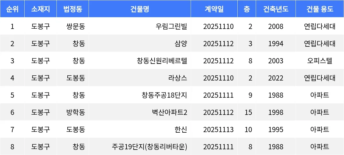 도봉동 라상스 45.47㎡ 2층 매물이 3억5천만원에 매매되었다. 창동 주공18단지 41.34㎡ 9층 매물은 4억5천만원에 거래됐다. 방학동 벽산아파트2 84.98㎡ 15층 매물이 5억5백만원에 거래됐다.