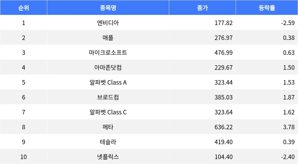 반면, 엔비디아는 2.59% 하락한 177.82달러에 장을 마감했다. 거래량은 3억 1천 396만 868주로 전 거래일 대비 4.73% 줄어들었다. 넷플릭스는 2.40% 하락하여 104.40달러에 거래를 종료했으며, 거래량은 3천 438만 7천 60주였다.