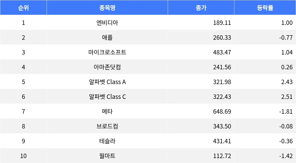 반면, 애플과 메타는 하락세를 보였습니다. 애플은 0.77% 하락하며 종가 260.33달러를 기록했고, 거래량은 4천 817만 4천 132주에 달했습니다. 메타 역시 1.81% 하락해 종가 648.69달러로 마감했습니다. 테슬라와 월마트도 각각 0.36%와 1.42% 하락하며 부진한 모습을 보였습니다.