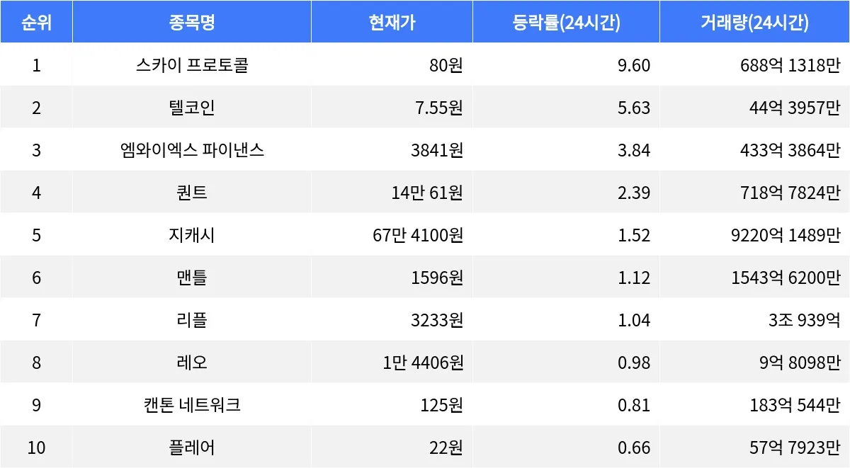 글로벌 가상자산 시황 중계 사이트 코인마켓캡(CoinMarketCap)에 따르면, 암호화폐 시장에서 스카이 프로토콜이 24시간 등락률 1위를 기록하며 주목받고 있다. 스카이 프로토콜은 24시간 동안 9.60% 상승하며 현재 80원에 거래되고 있다. 이 종목의 24시간 거래량은 688억 1318만 주에 달하며, 시가총액은 1조 8343억 원으로 순위는 54위에 자리 잡고 있다. 1시간 등락률은 0.76%로 상승세가 계속되고 있음을 보여준다.