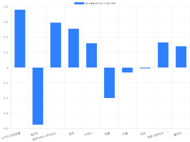 맨틀은 24시간 동안 1.12% 상승하며 1596원에 거래되고 있으며, 1시간 등락률은 -0.40%로 단기적으로는 하락세를 보인다. 리플은 1.04% 상승하며 3233원에 거래되고, 1시간 등락률은 -0.07%로 소폭 하락 중이다. 레오는 0.98% 상승하며 1만 4406원에 거래되고 있으며, 1시간 등락률은 -0.01%로 거의 변동이 없다. 캔톤 네트워크는 0.81% 상승하며 125원에 거래되고 있고, 1시간 등락률은 0.33%로 소폭 상승했다. 플레어는 0.66% 상승하며 22원에 거래되며, 1시간 등락률은 0.28%로 상승세를 이어가고 있다.