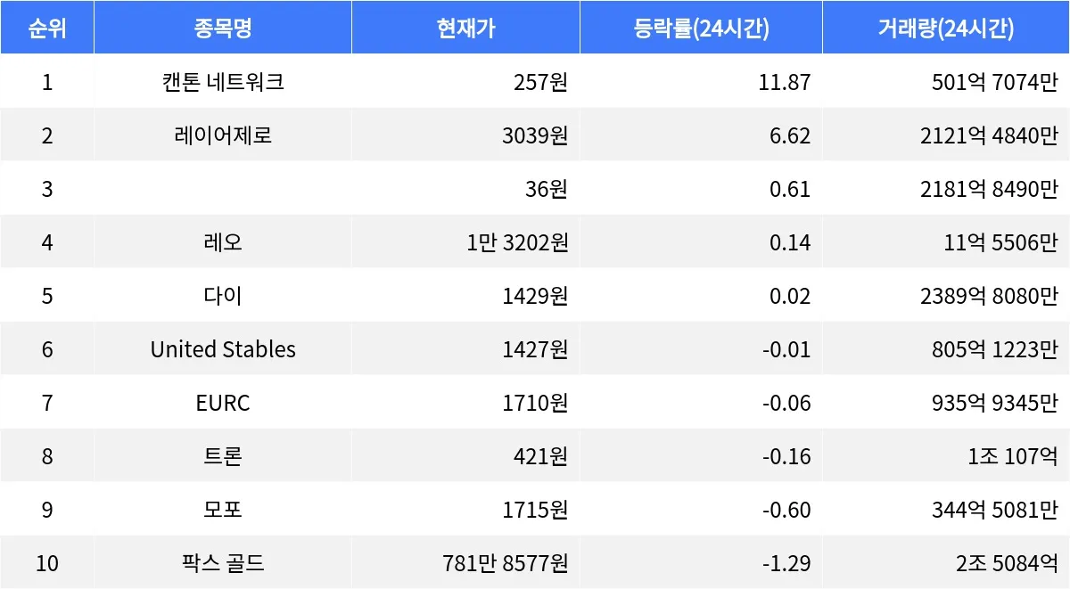 글로벌 가상자산 시황 중계 사이트 코인마켓캡(CoinMarketCap)에 따르면, 현재 암호화폐 시장의 24시간 등락률 상위 종목 가운데 캔톤 네트워크가 가장 두드러진 성과를 보이고 있다. 캔톤 네트워크는 24시간 동안 11.87% 상승하며 현재 257원에 거래되고 있으며, 1시간 동안 0.97% 상승세를 이어가고 있다. 거래량은 501억 7074만 주로, 시가총액 16위에 위치하면서 시장의 주목을 받고 있다.