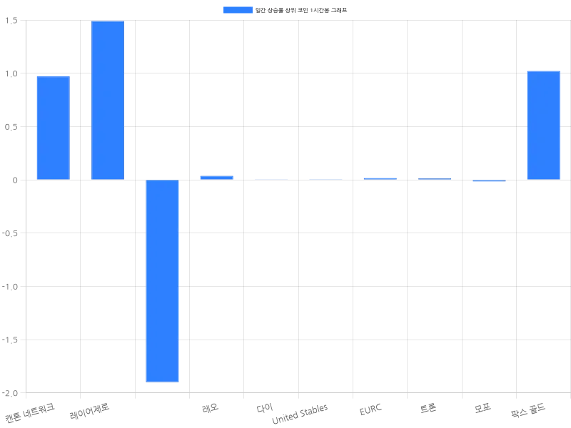 한편, United Stables는 24시간 동안 -0.01% 하락하며 1427원에 거래되고 있으며, EURC는 -0.06% 하락하여 1710원에 거래 중이다. 트론은 -0.16% 하락하며 421원에 거래되고 있으며, 모포는 -0.60% 하락하여 1715원에 거래되고 있다. 팍스 골드는 1.29% 하락하여 781만 8577원에 거래되고 있다.