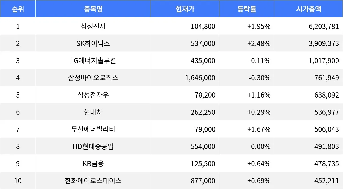 시가총액 3위에서 10위 종목 중 상승세를 보이는 종목으로는 삼성전자우(005935), 두산에너빌리티(034020), KB금융(105560), 한화에어로스페이스(012450) 등이 있다. 삼성전자우는 1.16% 상승하며 78,200원에 거래되고 있고, 두산에너빌리티는 1.67% 상승한 79,000원을 기록하고 있다. KB금융은 0.64% 상승하며 125,500원에, 한화에어로스페이스는 0.69% 상승하며 877,000원에 거래되고 있다.
