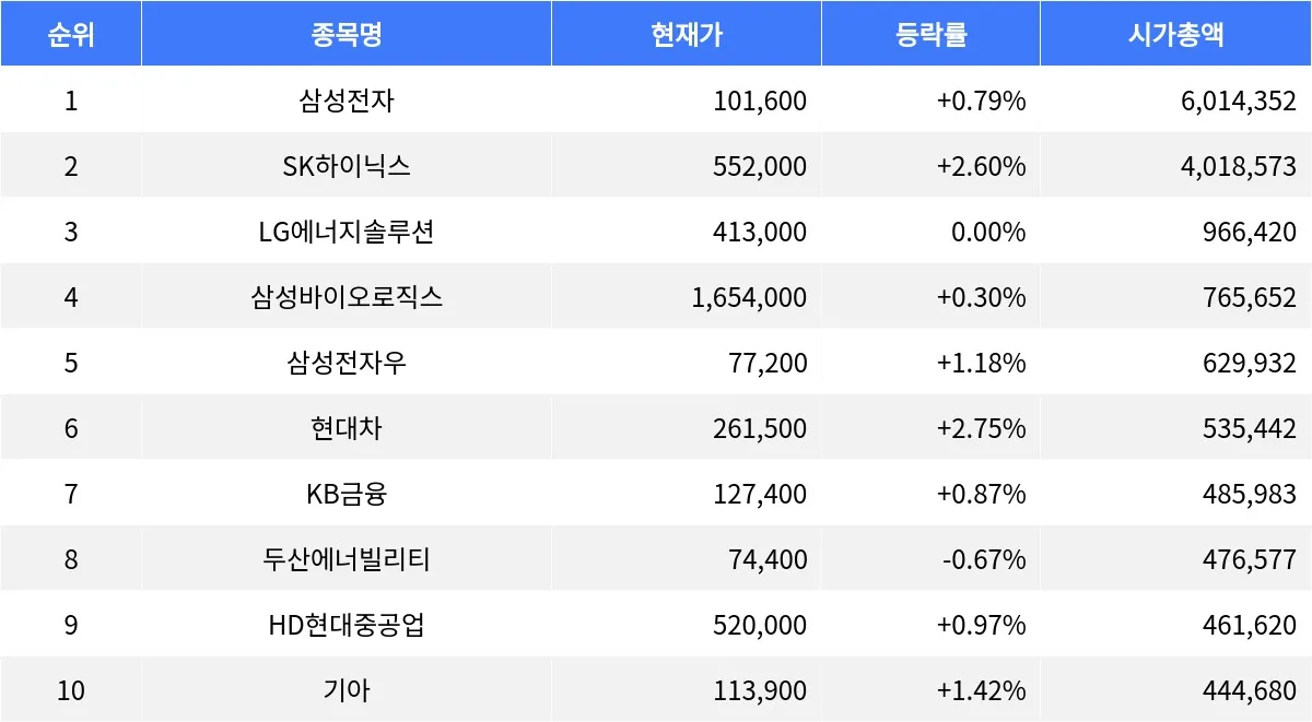 삼성전자 +0.79%, SK하이닉스 +2.60%, LG에너지솔루션 0.00%...