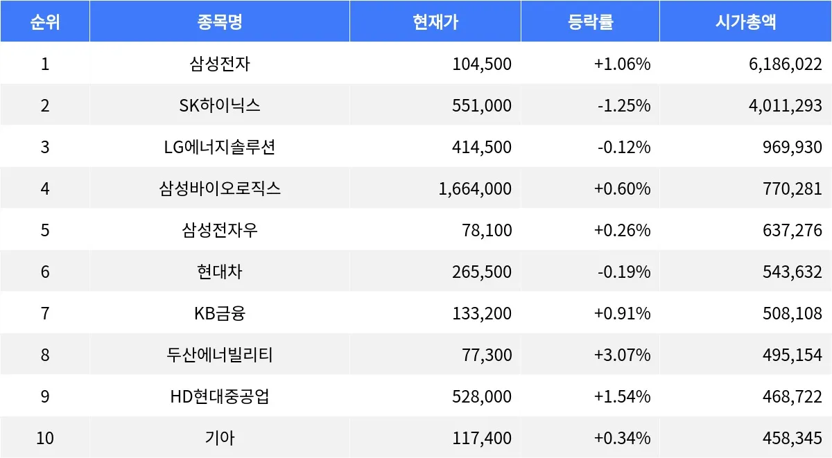 삼성전자 +1.06%, SK하이닉스 -1.25%, LG에너지솔루션 -0.12%...
