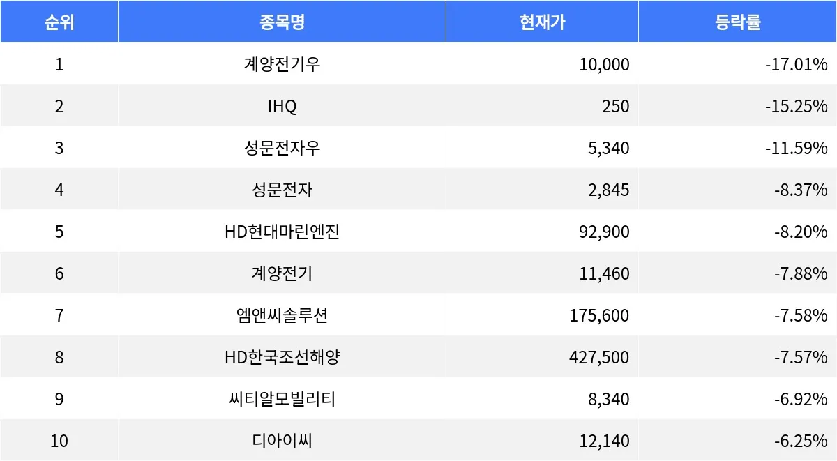 6위부터 10위까지의 종목으로는 계양전기(012200)(11,460원, -7.88%), 엠앤씨솔루션(484870)(175,600원, -7.58%), HD한국조선해양(009540)(427,500원, -7.57%), 씨티알모빌리티(308170)(8,340원, -6.92%), 디아이씨(092200)(12,140원, -6.25%)가 있었다.