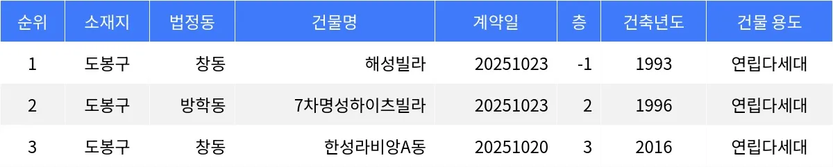 국토교통부 실거래가 공개시스템에 따르면, 10월 4주차 도봉구 부동산 시장에서 창동 해성빌라가 주간 최저 매매가를 기록했다. 창동 해성빌라 60.84㎡ 지하 1층 매물이 9천2백만원에 손바뀜이 일어났다.방학동 7차명성하이츠빌라 46.7㎡ 2층 매물이 1억3천만원에 거래됐다. 창동 한성라비앙A동 29.74㎡ 3층 매물은 2억원에 손바뀜이 이루어졌다.