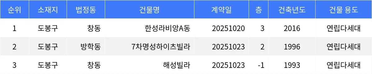 방학동 7차명성하이츠빌라 46.7㎡ 매물이 1억3천만원에 거래됐다. 창동 해성빌라 60.84㎡는 9천2백만원에 거래 완료됐다.