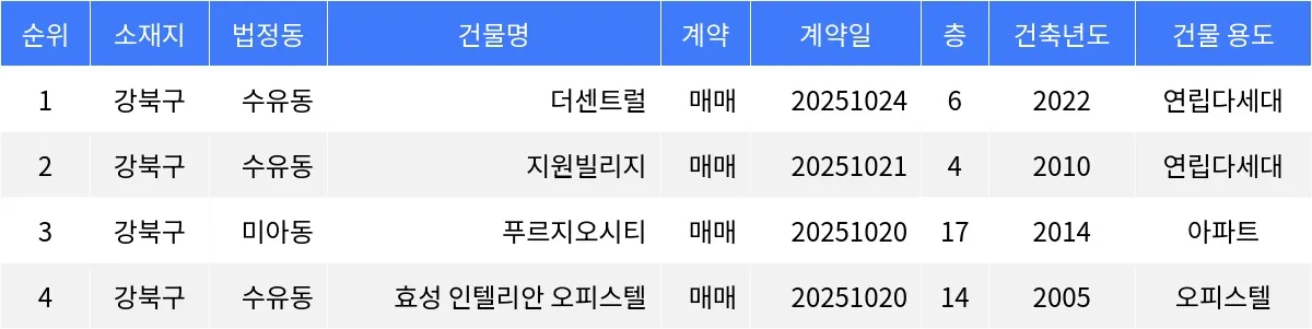 국토교통부 실거래가 공개시스템에 따르면, 10월 4주차 강북구 부동산 시장에서 수유동 더센트럴이 주간 최고 매매가를 기록했다. 수유동 더센트럴 51.54㎡ 6층 매물이 4억5천만원에 손바뀜이 일어났다.수유동 지원빌리지 52.18㎡ 4층 매물이 2억800만원에 거래됐다. 미아동 푸르지오시티 18.647㎡ 17층 매물이 1억3천5백만원에 매매됐다. 수유동 효성 인텔리안 오피스텔 28.82㎡ 14층 매물이 1억2천7백만원에 거래되었다.