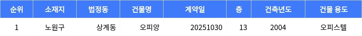 “매매가 1억 500만원”... 노원구 주간 최저가 매물, ‘상계동 오피앙’ WRITE. 2025 11 03 09:05 UPDATE. 2025 11 03 09:05 권정혁 기자 45주차 노원구 매매가 하위 매물 분석 국토교통부 실거래가 공개시스템에 따르면, 10월 5주차 노원구 부동산 시장에서 상계동 오피앙이 주간 최저 매매가를 기록했다. 상계동 오피앙 23.37㎡ 13층 매물이 10월 30일 1억500만원에 손바뀜이 일어났다.노원구 상계동 소재 23.37㎡의 오피스텔 매물이 1억500만원에 거래됐다. ݱ ݱ 권정혁 기자 kjh@news-wa.com 오피앙 저작권자 ⓒ 뉴스와, 무단 전재 및 재배포 금지
