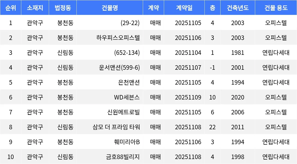 신림동 삼모 더 프라임 타워 오피스텔은 43.68㎡ 면적과 22층에 위치하며, 2억9천만원에 거래되었다. 봉천동 훼미리아B 주택은 64.74㎡ 면적과 3층에 있으며, 3억2천5백만원에 매매되었다.