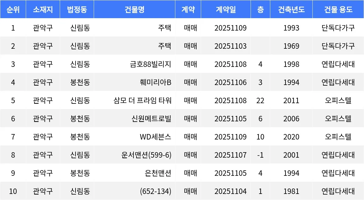 신림동 소재 주택은 매매가 9억5천만원에 거래됐고, 또 다른 신림동 주택은 6억5천5백만원에 손바뀜이 일어났다. 신림동 금호88빌리지는 4억3천5백만원에 거래됐으며, 봉천동 훼미리아B는 3억2천5백만원에 거래됐다. 신림동 삼모 더 프라임 타워는 2억9천만원에 매매가 이뤄졌고, 봉천동 신원메트로빌은 2억5천5백만원에 거래됐다. 봉천동 WD세븐스는 2억4천9백만원에 거래됐으며, 신림동 운서맨션은 1억7천만원에 거래됐다. 봉천동 은천맨션은 1억7천만원에 손바뀜이 있었고, 신림동 652-134번지는 1억5천만원에 거래됐다.