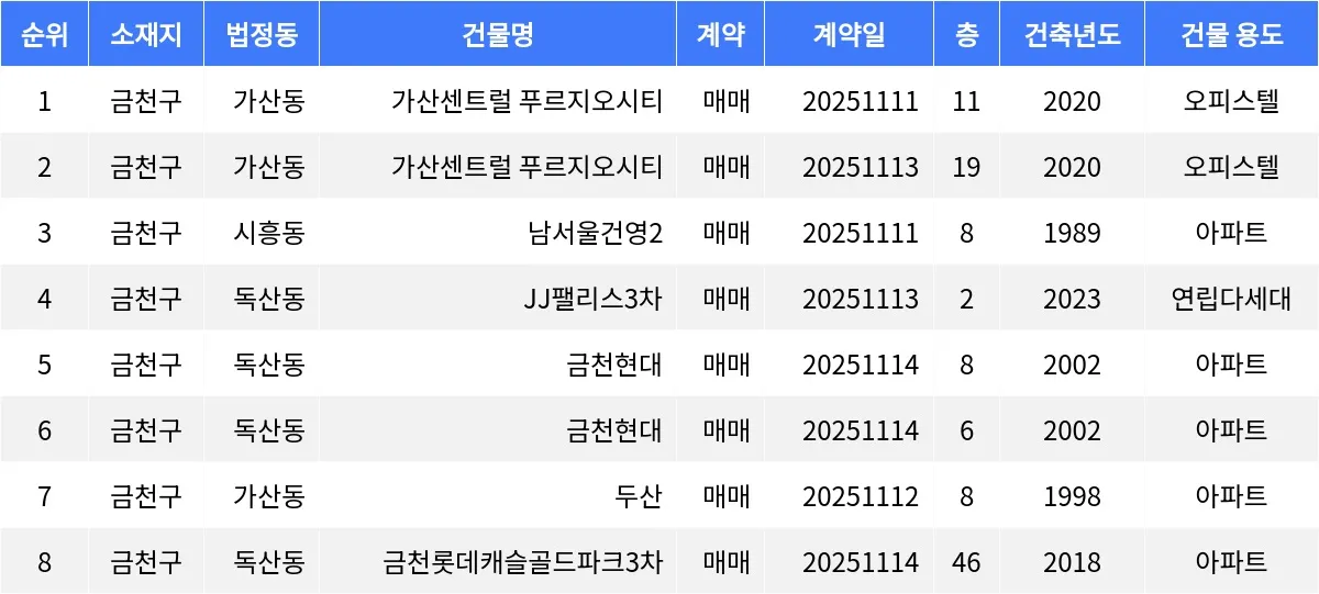 가산동 가산센트럴 푸르지오시티 17.62㎡ 19층 매물이 1억4천만원에 거래됐다. 시흥동 남서울건영2 41.34㎡ 8층 매물이 2억8천5백만원에 매매됐다.