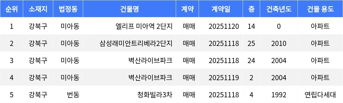 미아동 삼성래미안트리베라2단지와 미아동 벽산라이브파크는 각각 높은 가격에 거래되며, 강북구 부동산 시장의 활기를 보여주고 있다. 번동 청화빌라3차는 상대적으로 저렴한 가격대로 거래되었다.