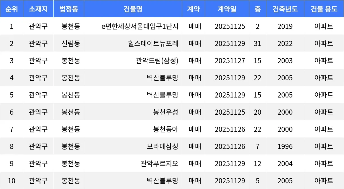 관악구 신림동 힐스테이트뉴포레 59.99㎡ 31층 매물이 12억8천5백만원에 거래됐다. 봉천동 관악드림 114.75㎡ 15층 매물이 11억5천만원에 매매됐다.