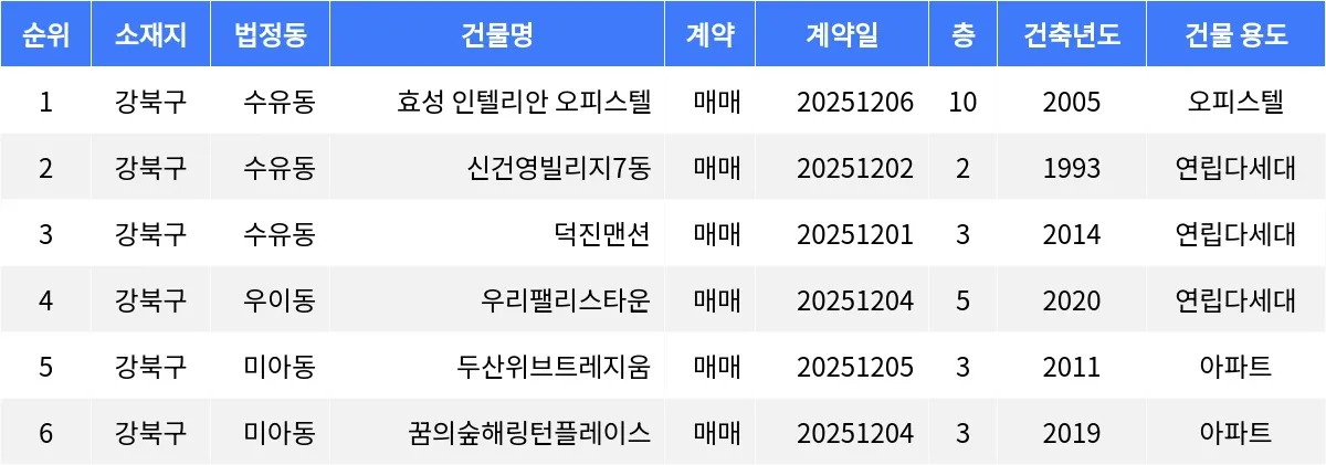 국토교통부 실거래가 공개시스템에 따르면, 12월 1주차 강북구 부동산 시장에서 수유동 효성 인텔리안 오피스텔이 주간 최저 매매가를 기록했다. 이 오피스텔 30.49㎡ 10층 매물이 12월 6일 1억2천7백만원에 거래되었다.