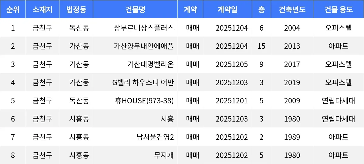가산동 G밸리 하우스디 어반 19.636㎡ 3층 매물은 1억4천2백만원에 새로운 주인을 찾았다. 독산동의 휴HOUSE 64.09㎡ 5층 매물도 2억4천만원에 거래되었다.