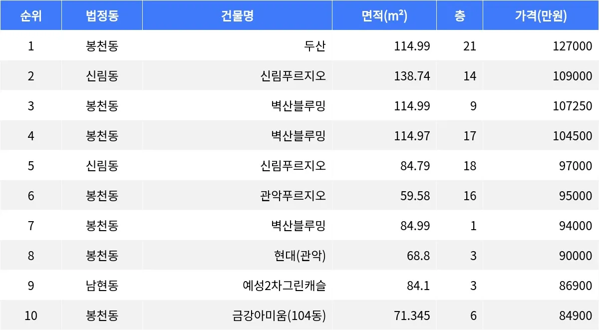 신림동 신림푸르지오 138.74㎡ 14층 매물이 10억9천만원에 거래됐다. 봉천동 벽산블루밍 114.99㎡ 9층 매물이 10억7천250만원에 계약됐다. 봉천동 벽산블루밍 114.97㎡ 17층 매물은 10억4천500만원에 매매됐다.