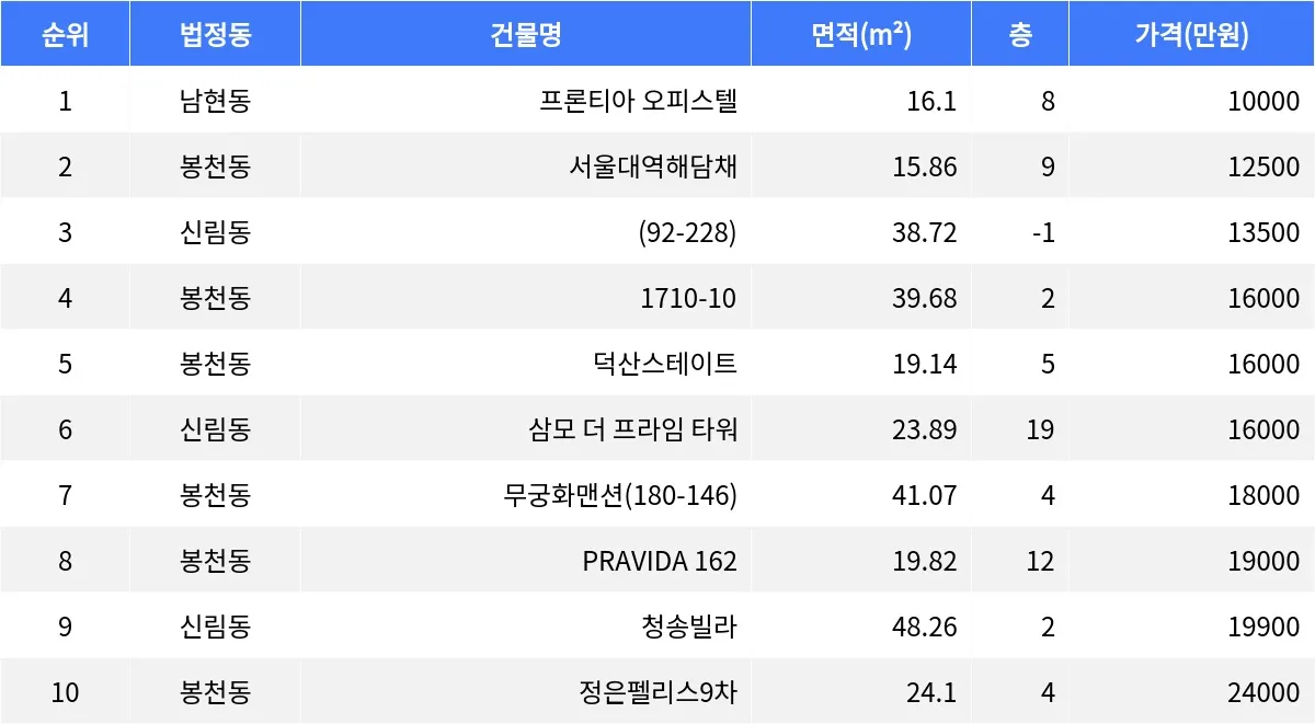 국토교통부 실거래가 공개시스템에 따르면, 12월 3주차 관악구 부동산 시장에서 남현동 프론티아 오피스텔이 주간 최저 매매가를 기록했다. 남현동 프론티아 오피스텔 16.1㎡ 8층 매물이 1억원에 거래가 이루어졌다.