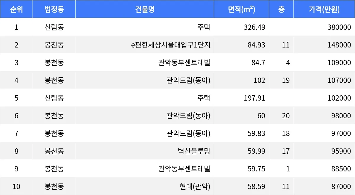 또한 봉천동 관악드림(동아) 102㎡ 19층 매물이 10억7천만원에 거래되었으며, 신림동 소재 197.91㎡의 주택 매물은 10억2천만원에 매매되었다.