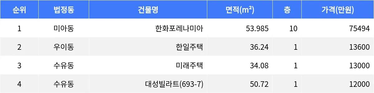 우이동 한일주택 36.24㎡ 1층 매물이 1억3천600만원에 손바뀜이 이루어졌다. 수유동 미래주택 34.08㎡ 1층 매물은 1억3천만원에 거래되었다.