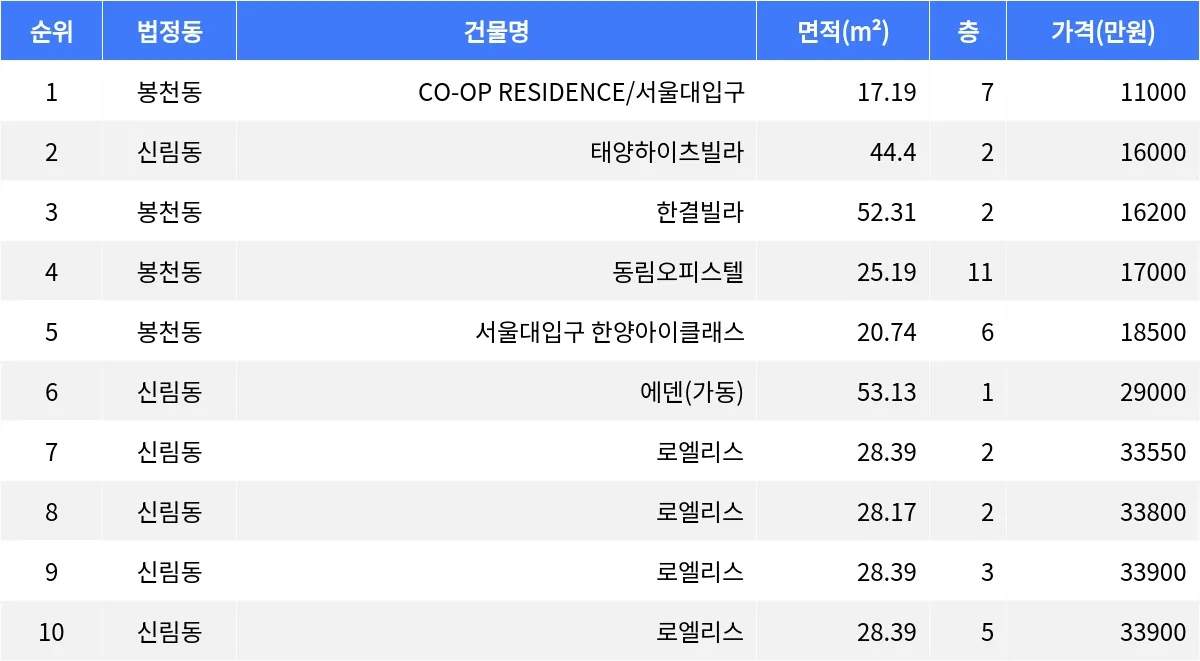 국토교통부 실거래가 공개시스템에 따르면, 1월 1주차 관악구 부동산 시장에서 봉천동 CO-OP RESIDENCE가 주간 최저 매매가를 기록했다. 17.19㎡ 7층 매물이 1월 3일에 1억1천만원에 손바뀜이 일어났다.