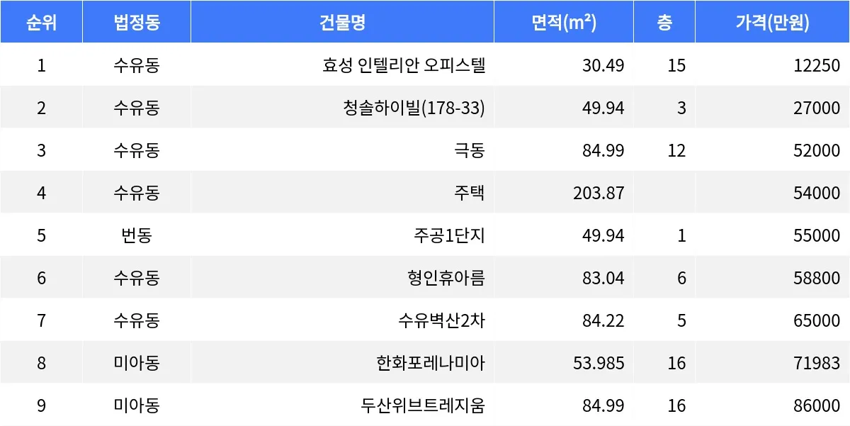 국토교통부 실거래가 공개시스템에 따르면, 1월 4주차 강북구 부동산 시장에서 수유동 효성 인텔리안 오피스텔이 주간 최저 매매가를 기록했다. 수유동 효성 인텔리안 오피스텔 30.49㎡ 15층 매물이 1억2천250만원에 거래되었다.
