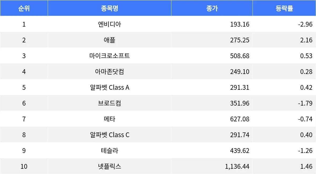반면, 엔비디아는 전 거래일 대비 2.96% 하락한 193.16달러에 마감하며 약세를 보였다. 거래량은 1억 7천 460만 2천 972주로 가장 많았다. 브로드컴 역시 1.79% 하락한 351.96달러에 마감했다. 테슬라도 1.26% 떨어져 439.62달러로 장을 마쳤다.
