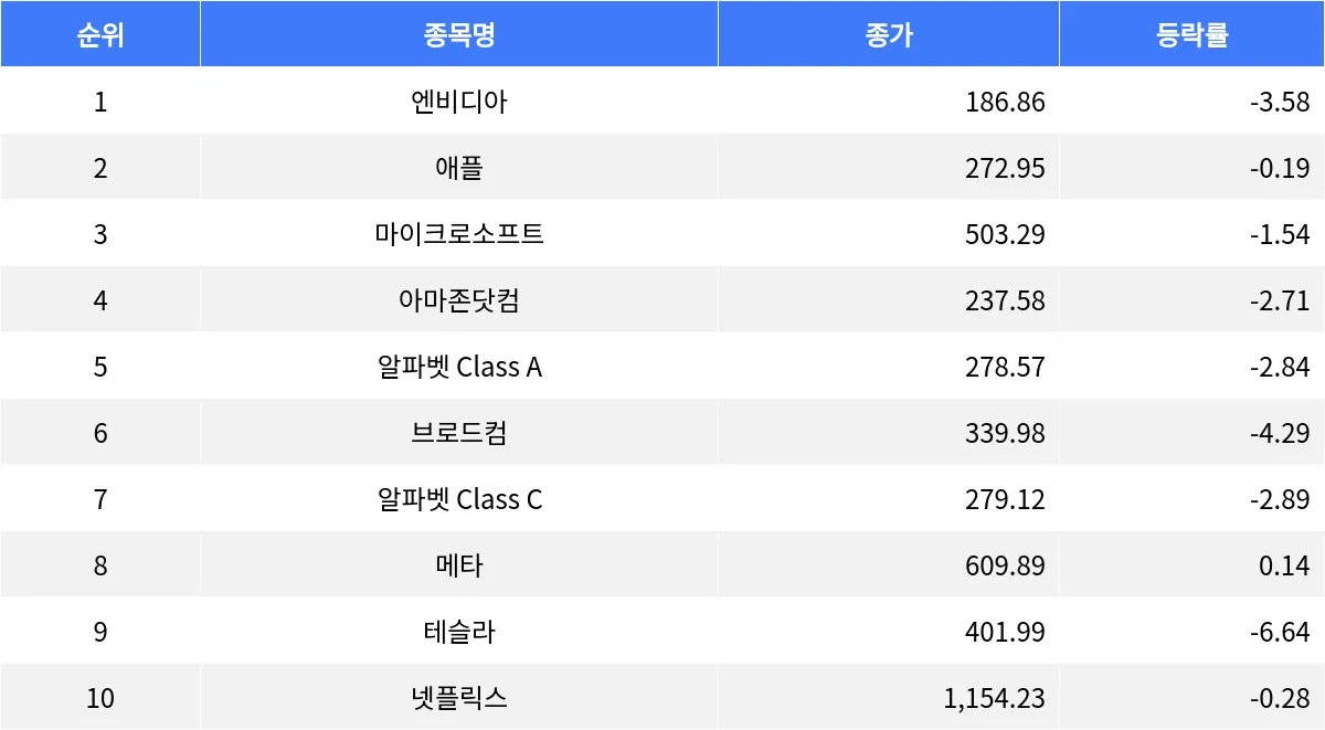 주요 하락 종목으로는 엔비디아가 3.58% 하락하며 종가 186.86달러로 거래를 마감했다. 거래량은 2억 564만 4천 817주로, 전 거래일 대비 6.94달러 하락했다. 테슬라는 6.64% 급락하며 종가 401.99달러를 기록했고, 거래량은 1억 1천 769만 8천 51주였다. 전 거래일 대비 28.61달러 하락했다.