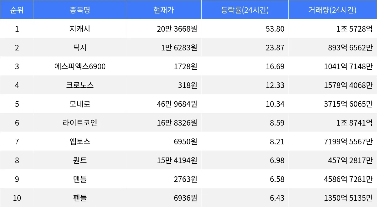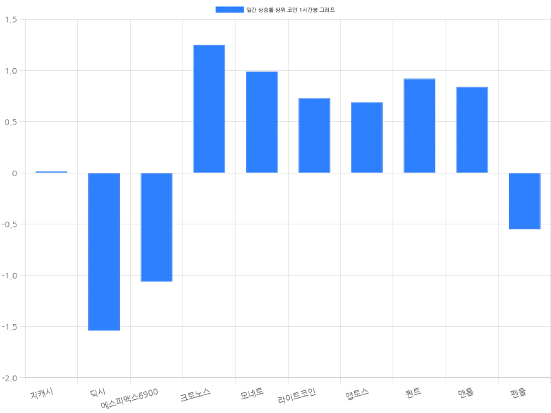 라이트코인은 8.59% 상승하여 16만 8326원에 거래되고 있으며, 1시간 등락률은 0.73%로 긍정적인 흐름을 유지하고 있다. 앱토스는 8.21% 상승하며 6950원에 거래되고, 1시간 동안 0.69%의 상승세를 기록했다. 퀀트는 6.98% 상승하여 15만 4194원에 거래되며, 1시간 등락률은 0.92%로 상승세를 지속하고 있다. 맨틀은 6.58% 상승하여 2763원에 거래되며, 1시간 동안 0.84% 상승했다. 펜들은 6.43% 상승하여 6936원에 거래되고 있으며, 1시간 등락률은 -0.55%로 하락세를 보였다.