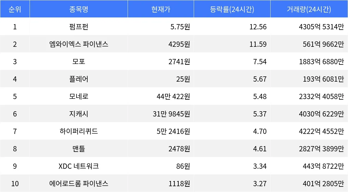 글로벌 가상자산 시황 중계 사이트 코인마켓캡(CoinMarketCap)에 따르면, 펌프펀은 12.56%의 상승률을 기록하며 가장 두드러진 성과를 보이고 있다. 현재 5.75원에 거래되고 있으며, 24시간 동안 4305억 5314만 원에 달하는 거래량을 기록했다. 1시간 등락률 또한 3.59%로 상승세를 이어가고 있다. 펌프펀의 시가총액은 2조 347억 원으로, 시가총액 순위는 55위에 머무르고 있다.엠와이엑스 파이낸스는 11.59% 상승하며 현재 4295원에 거래되고 있다. 24시간 동안의 거래량은 561억 9662만 원에 이르며, 1시간 동안의 상승률은 2.13%로 단기 상승세를 지속 중이다. 시가총액은 8854억 1148만 원으로, 시가총액 순위 93위를 기록하고 있다.