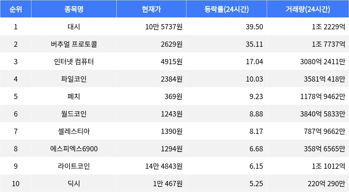 한편, 월드코인은 8.88% 상승했으며, 셀레스티아는 8.17% 상승했다. 에스피엑스6900과 라이트코인은 각각 6.68%와 6.15% 상승을 기록했으며, 딕시는 5.25% 상승했다.