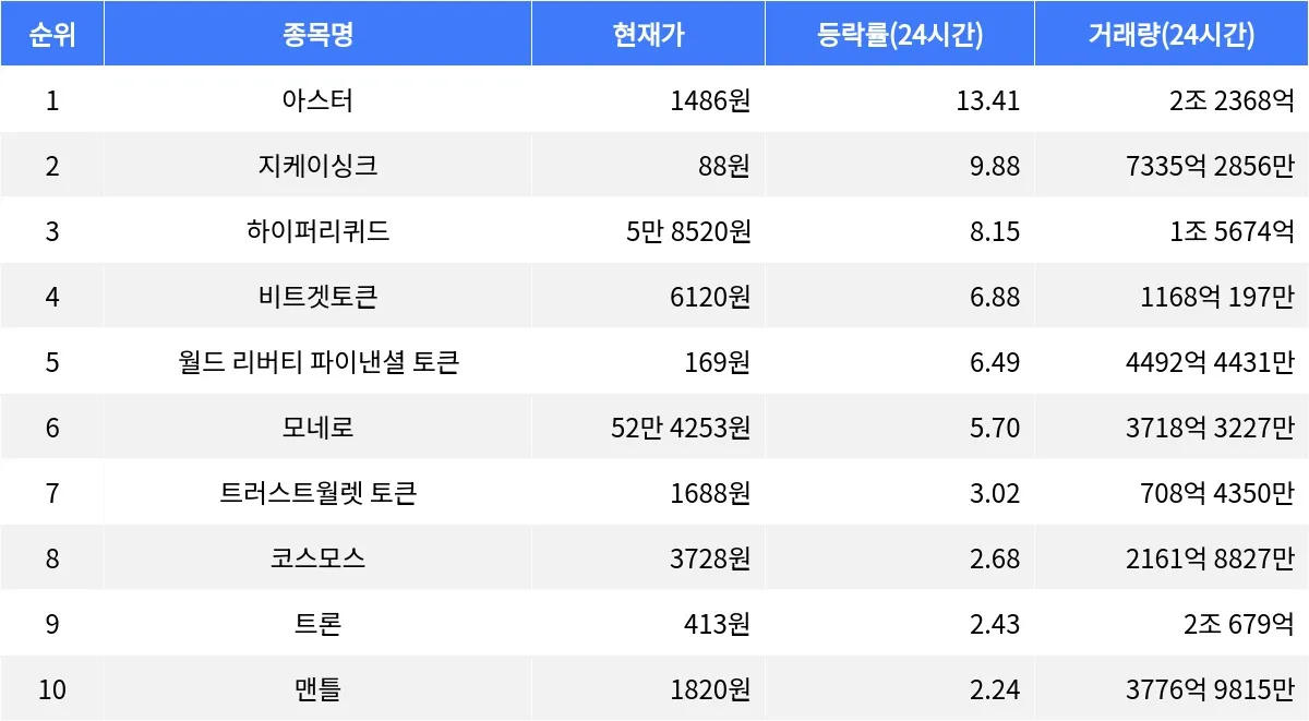 글로벌 가상자산 시황 중계 사이트 코인마켓캡(CoinMarketCap)에 따르면, 오늘 암호화폐 시장에서 아스터가 24시간 등락률 13.41%로 가장 높은 상승세를 기록하며 주목받고 있다. 아스터의 현재가는 1486원이며, 24시간 거래량은 2조 2368억 원에 달했다. 최근 1시간 동안 0.96% 상승한 아스터는 단기적으로도 상승세를 유지하고 있다.
