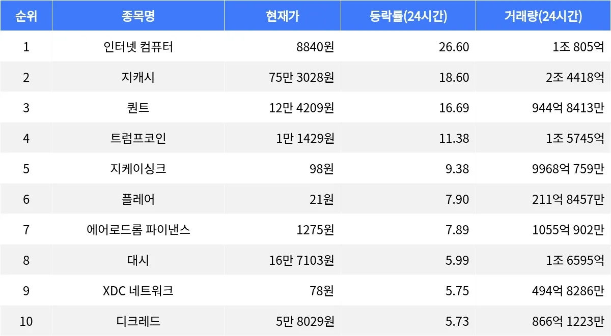 글로벌 가상자산 시황 중계 사이트 코인마켓캡(CoinMarketCap)에 따르면, 최근 암호화폐 시장에서 인터넷 컴퓨터(Internet Computer, ICP)가 가장 두드러진 상승세를 보이고 있다. 인터넷 컴퓨터는 24시간 동안 26.60% 상승하며 현재 8840원에 거래되고 있으며, 시가총액은 4조 7697억 원으로 31위에 위치하고 있다. 24시간 거래량은 1조 805억 원에 달하며, 1시간 동안 3.24% 상승하며 지속적인 상승세를 이어가고 있다.