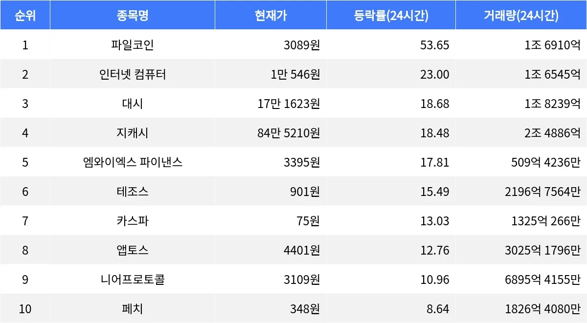 글로벌 가상자산 시황 중계 사이트 코인마켓캡(CoinMarketCap)에 따르면, 암호화폐 시장에서 파일코인이 24시간 동안 53.65% 상승하며 가장 높은 상승률을 기록했다. 현재 파일코인은 3089원에 거래되며, 24시간 거래량은 1조 6910억 원에 달하고 있다. 시가총액 52위로, 최근 1시간 동안에도 2.45% 상승세를 이어가며 주목받고 있다.