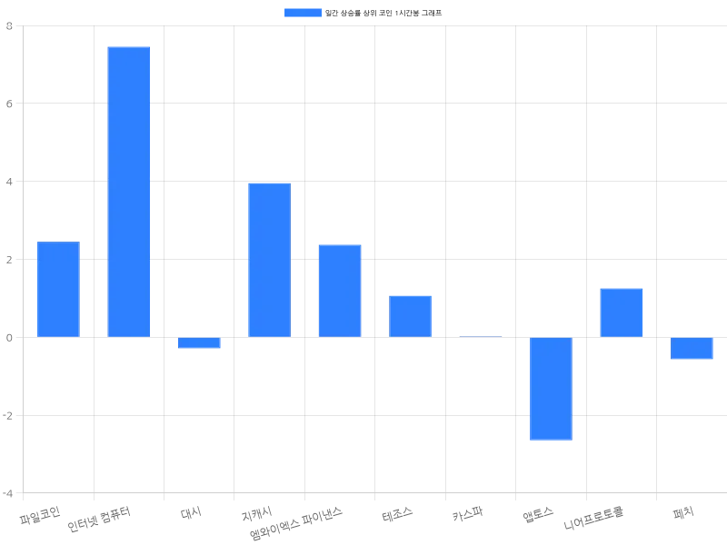 앱토스는 12.76% 상승하며 4401원에 거래되고 있으나, 1시간 동안 2.64% 하락으로 단기 하락세를 보이고 있다. 니어프로토콜은 24시간 동안 10.96% 상승하며 3109원에 거래 중이며, 1시간 동안에는 1.25% 상승을 기록하고 있다. 페치는 8.64% 상승하며 348원에 거래되고 있지만, 1시간 동안 0.56% 하락하며 조정을 받고 있다.