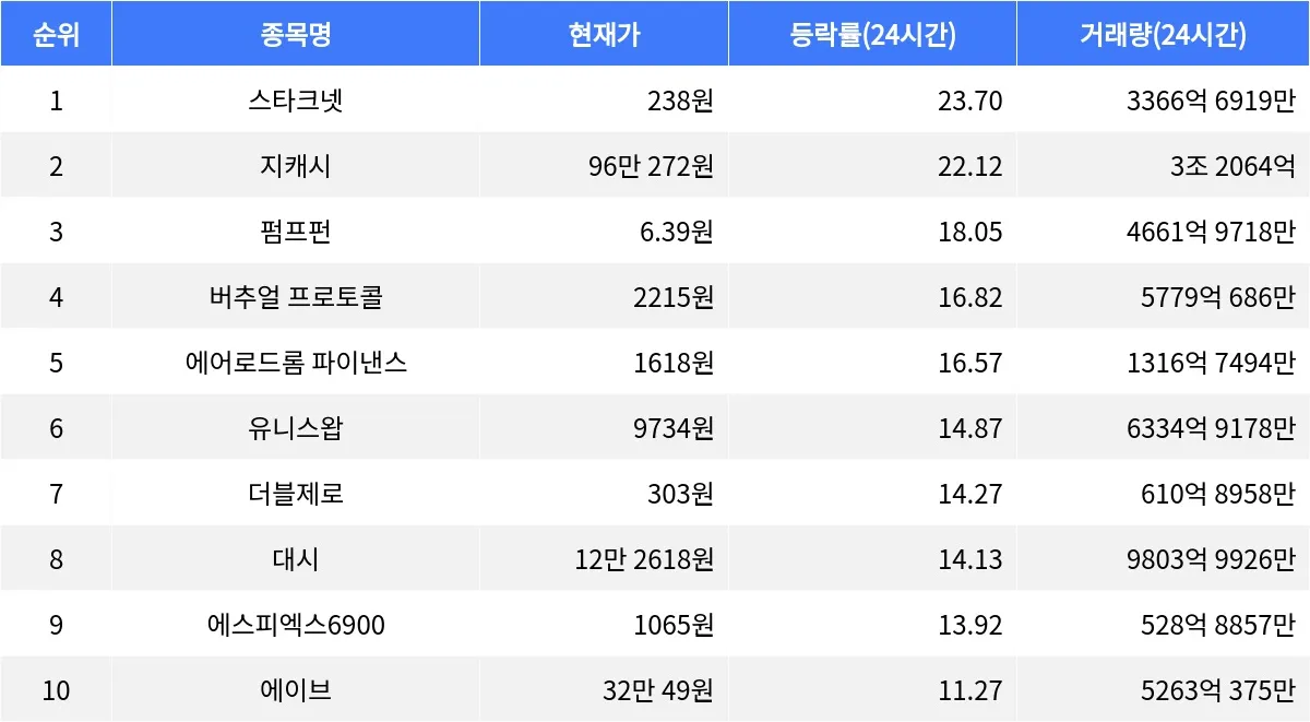 글로벌 가상자산 시황 중계 사이트 코인마켓캡(CoinMarketCap)에 따르면, 암호화폐 시장에서 스타크넷이 24시간 등락률 1위에 오르며 주목을 받고 있다. 스타크넷은 23.70% 상승하며 현재 238원에 거래되고 있으며, 24시간 거래량은 3366억 6919만 원에 달했다. 1시간 동안 7.11% 상승하며 단기 상승세가 지속되고 있다.