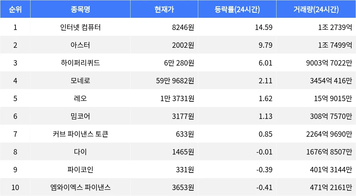글로벌 가상자산 시황 중계 사이트 코인마켓캡(CoinMarketCap)에 따르면, 24시간 동안 인터넷 컴퓨터가 14.59% 상승하며 가장 높은 등락률을 기록했다. 인터넷 컴퓨터는 현재 8246원에 거래되고 있으며, 24시간 거래량은 1조 2739억 원에 달했다. 1시간 등락률은 -2.75%로 반전세를 보이고 있지만, 24시간 동안의 상승세는 여전히 강력하다.