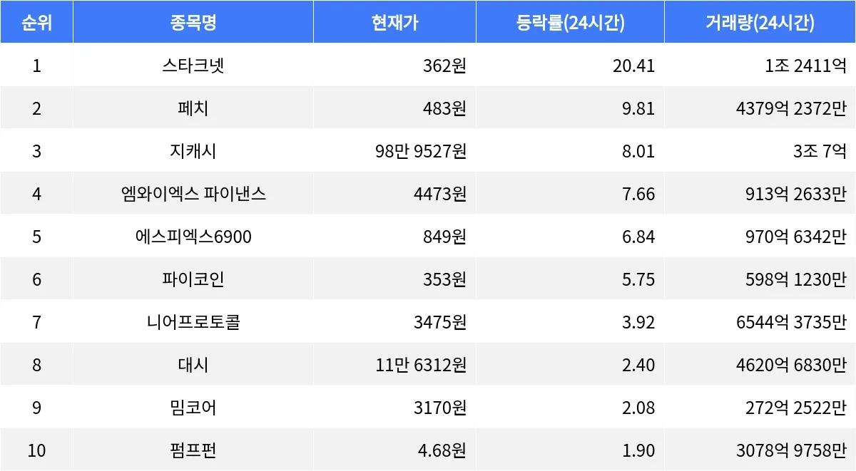 글로벌 가상자산 시황 중계 사이트 코인마켓캡(CoinMarketCap)에 따르면, 현재 암호화폐 시장에서 스타크넷이 24시간 동안 20.41% 상승하며 가장 주목받고 있다. 스타크넷은 현재 362원에 거래되고 있으며, 24시간 거래량은 1조 2411억 원에 달한다. 시가총액 63위에 자리 잡고 있는 스타크넷의 1시간 등락률은 0.52%로 소폭 상승하며 긍정적인 흐름을 이어가고 있다.