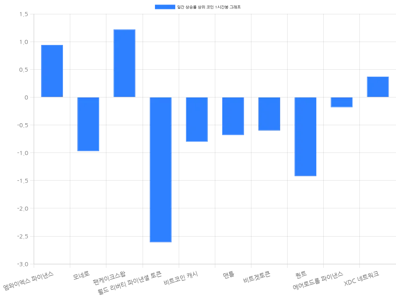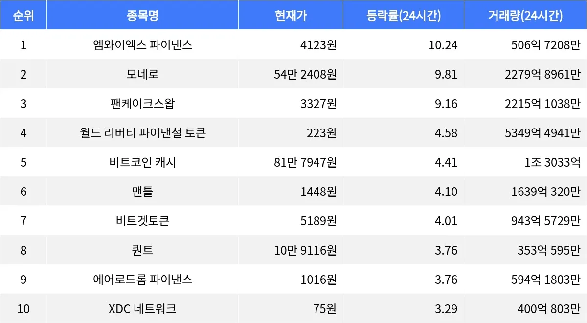 맨틀은 24시간 동안 4.10% 상승하며 현재 1448원에 거래되고 있다. 비트겟토큰은 4.01% 상승하며 5189원에 거래 중이다. 퀀트와 에어로드롬 파이낸스는 각각 3.76% 상승하며 각각 10만 9116원, 1016원에 거래되고 있다. XDC 네트워크는 3.29% 상승하며 75원에 거래 중이다.