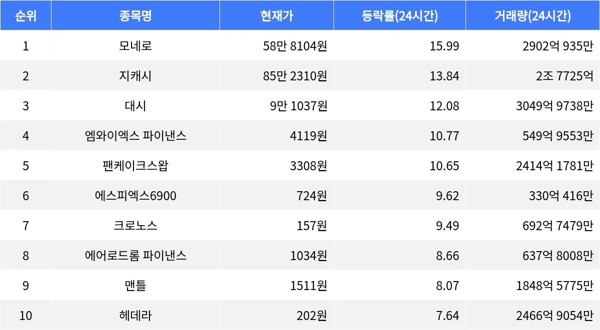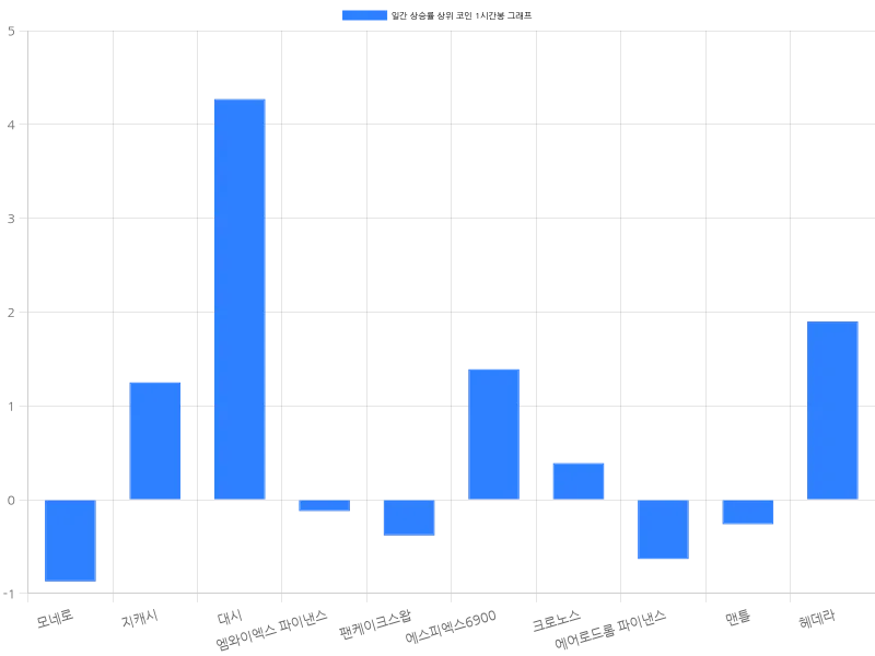 한편, 에스피엑스6900은 24시간 동안 9.62% 상승하며 724원에 거래되고 있으며, 1시간 동안 1.39% 상승했다. 크로노스는 9.49% 상승하여 157원에 거래되었고, 1시간 동안 0.39% 상승하며 단기 상승세를 유지하고 있다. 에어로드롬 파이낸스는 8.66% 상승하여 1034원에 거래되고 있으며, 1시간 동안 -0.63% 하락했다. 맨틀은 8.07% 상승하며 1511원에 거래 중이고, 1시간 동안 -0.26% 하락했다. 헤데라는 7.64% 상승하여 202원에 거래되고 있으며, 1시간 동안 1.90% 상승했다.