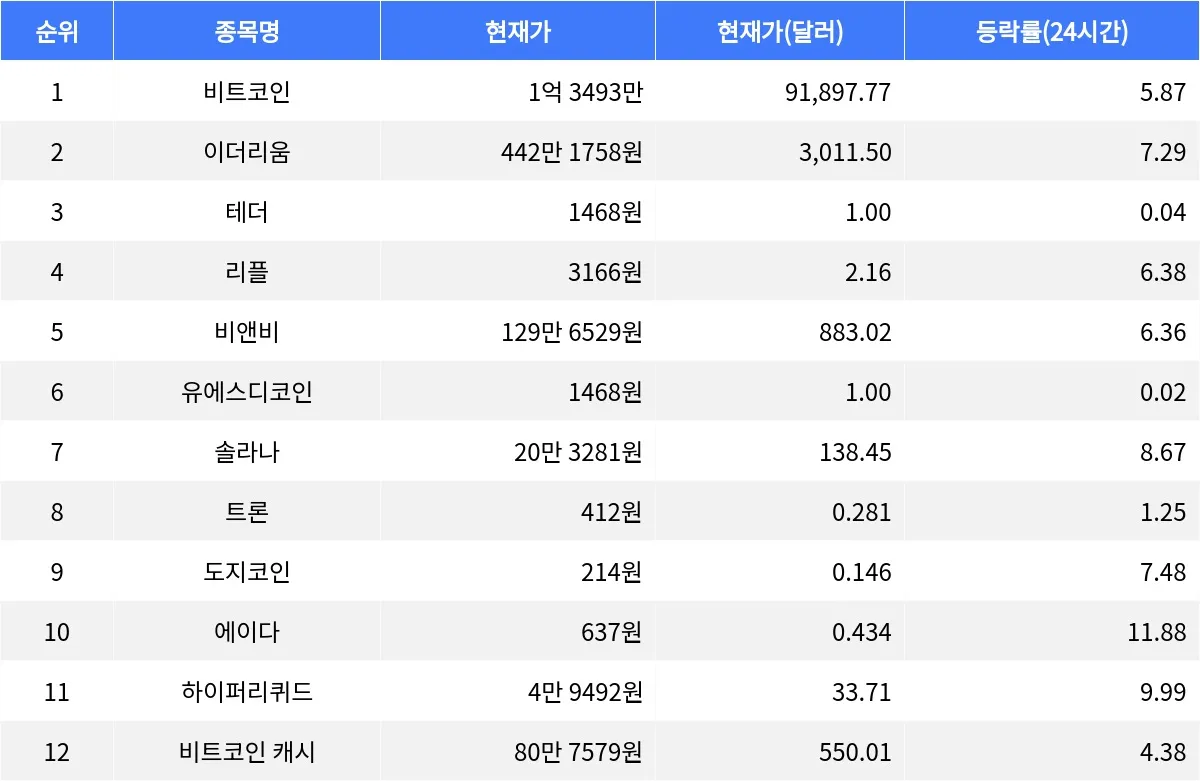 도지코인은 현재 214원으로 7.48% 상승했다. 도지코인은 밈코인으로, 주로 온라인 커뮤니티에서 팁을 주고받는 용도로 사용된다. 거래량은 2조 1139억원이다.