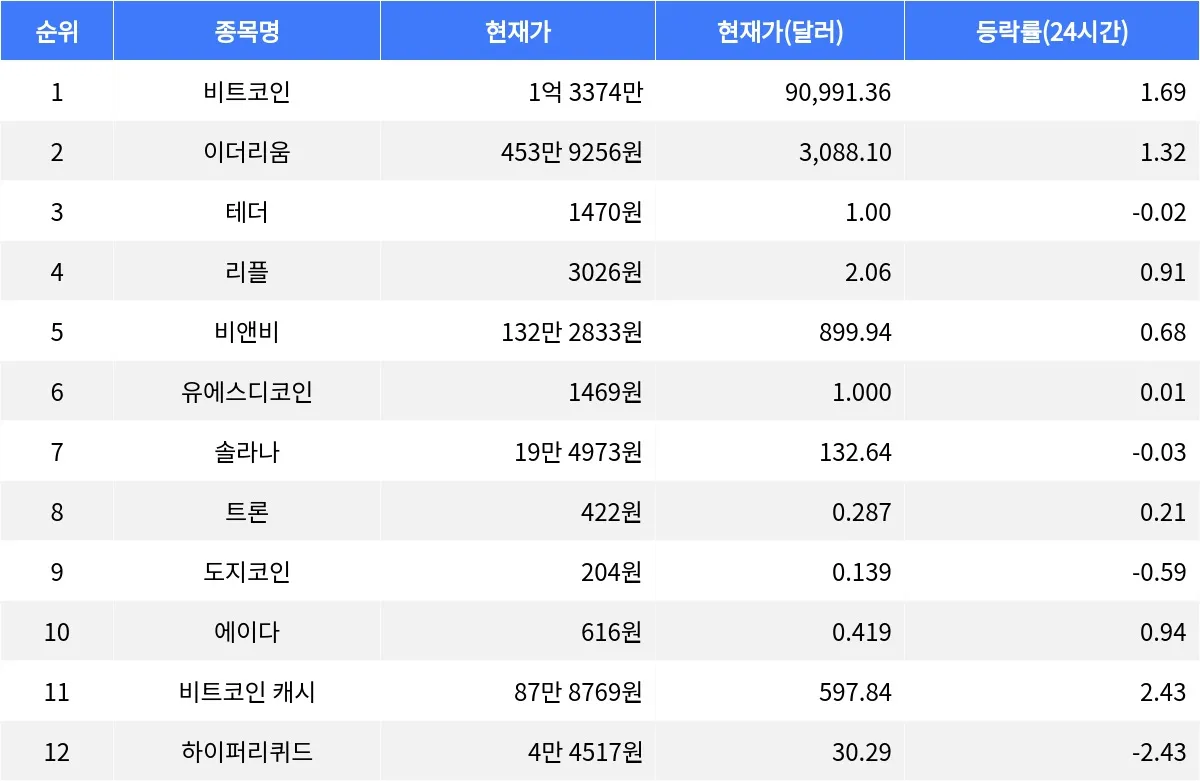 8일 10시 30분 글로벌 가상자산 시황 중계 사이트 코인마켓캡(CoinMarketCap)에 따르면, 비트코인의 현재가는 1억 3374만원이며, 24시간 동안 1.69% 상승했다. 비트코인은 가장 널리 알려진 가상자산으로, 탈중앙화 통화 시스템을 제공하고 있으며, 많은 거래소에서 가장 기본적인 거래 쌍으로 활용된다. 24시간 거래량은 71조 2304억원이다.