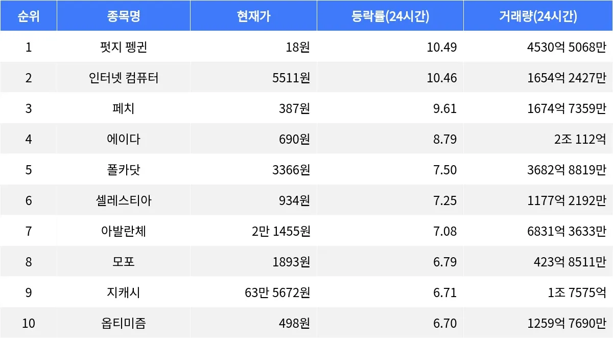 한편, ‘셀레스티아’는 24시간 동안 7.25% 상승하여 현재 934원에 거래되고 있다. ‘아발란체’는 7.08% 상승하며 2만 1455원에 거래되고 있다. ‘모포’는 6.79% 상승하며 1893원에 거래 중이다. ‘지캐시’는 6.71% 상승하여 63만 5672원에, ‘옵티미즘’은 6.70% 상승하여 498원에 거래되고 있다.