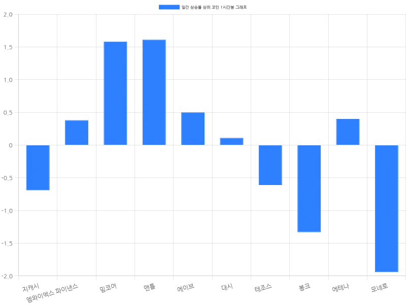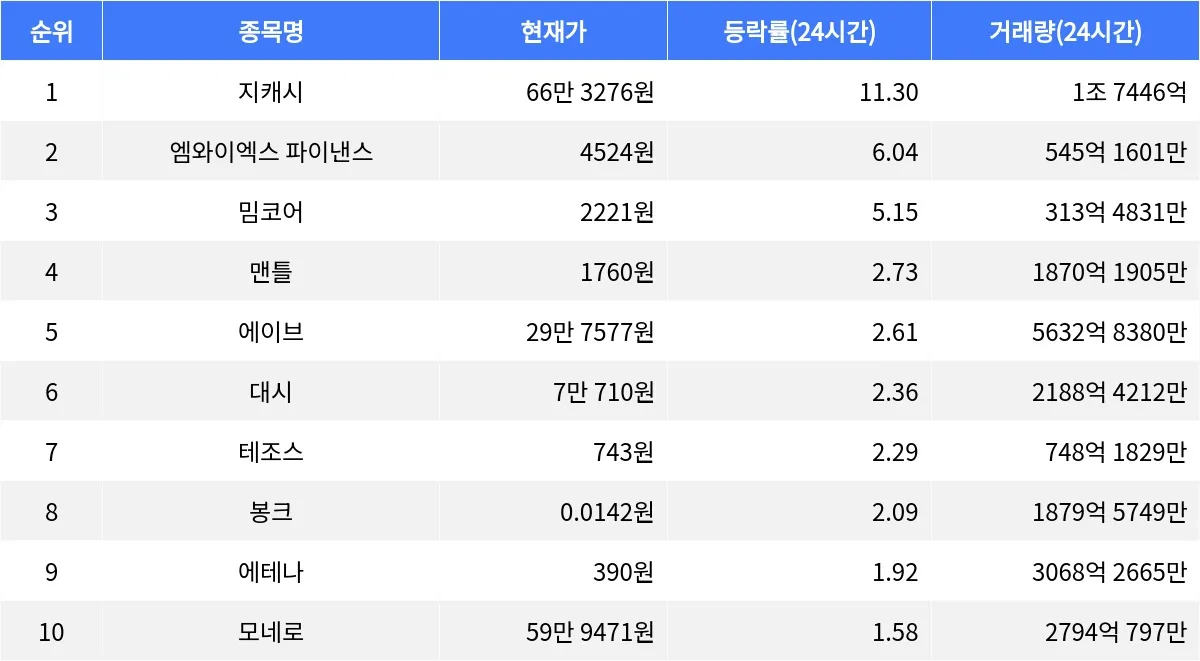 시가총액 43위의 밈코어는 24시간 동안 5.15% 상승하며 현재 2221원에 거래되고 있다. 1시간 동안 1.58% 상승하며 강한 상승세를 이어가고 있다. 시가총액 28위 맨틀은 24시간 동안 2.73% 상승하며 현재 1760원에 거래되고 있다. 최근 한 시간 동안 1.61% 상승하면서 단기 상승 흐름이 강화되고 있다. 시가총액 33위 에이브는 24시간 동안 2.61% 상승하며 현재 29만 7577원에 거래되고 있다. 1시간 동안 0.50% 상승하며 안정적인 상승세를 지속하고 있다.
