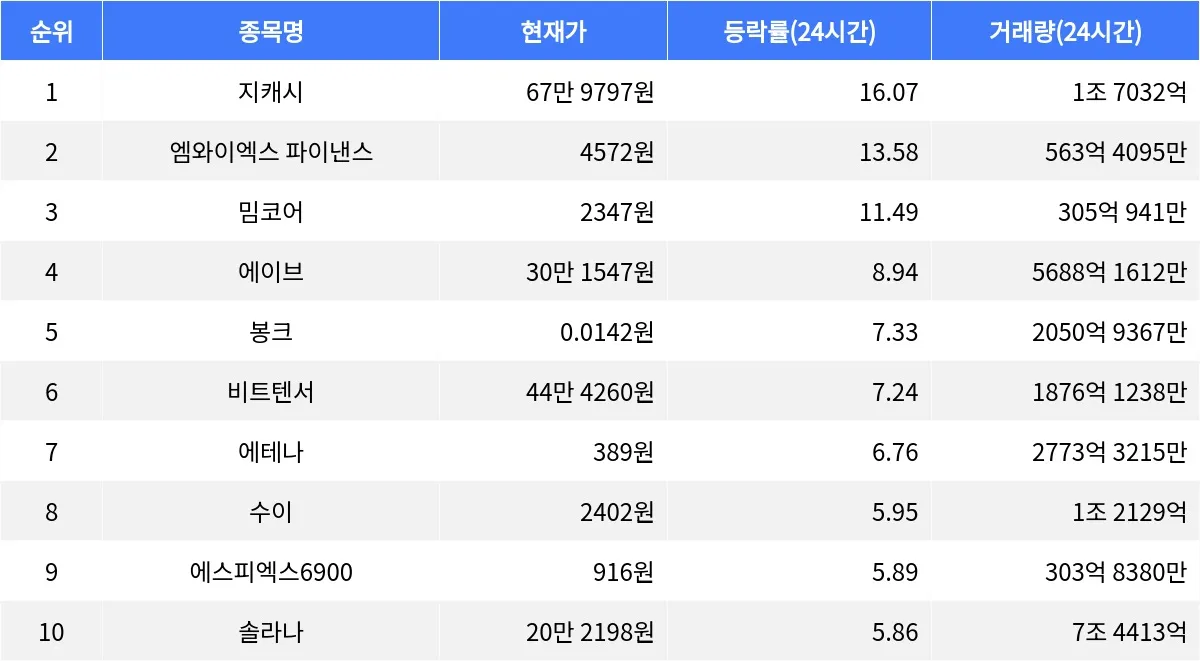 뒤이어 엠와이엑스 파이낸스가 24시간 동안 13.58% 상승하며 주목받고 있다. 현재 거래가는 4572원이며, 시가총액은 1조 1497억 원으로 71위를 차지하고 있다. 1시간 등락률은 0.28%로, 상승세가 계속 이어질 가능성을 보여준다. 24시간 거래량은 563억 4095만 원으로, 지캐시에 비해 다소 낮은 수준이지만 상승 추세는 강하다.