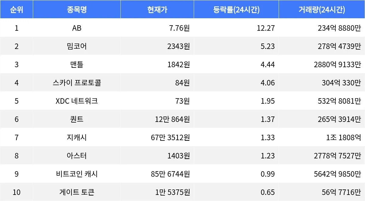 상위 10종목 중 일부 종목의 기술적 특징을 살펴보면, AB는 블록체인 기반의 다양한 애플리케이션을 지원하는 플랫폼으로, 최근 높은 거래량과 함께 주목받고 있다. 밈코어는 탈중앙화 금융(DeFi) 생태계에서 활용될 수 있는 다양한 기능을 제공하는 플랫폼으로, 최근의 상승세를 통해 시장에서의 입지를 강화하고 있다. 맨틀은 고성능 스마트 계약을 지원하는 블록체인 플랫폼으로, 거래량 증가와 함께 상승세를 지속하고 있다.
