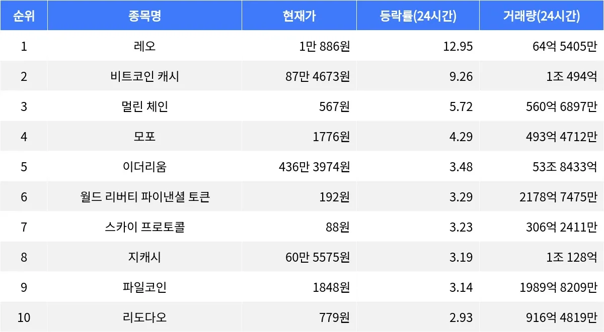 글로벌 가상자산 시황 중계 사이트 코인마켓캡(CoinMarketCap)에 따르면, 암호화폐 시장에서 레오가 24시간 동안 가장 높은 상승률을 기록하며 주목받고 있다. 레오는 24시간 동안 12.95% 상승하며 1만 886원에 거래되고 있다. 거래량은 64억 5405만으로 시가총액 16위를 기록 중이다. 1시간 등락률은 0.20%로, 단기적으로도 상승세를 유지하고 있다.